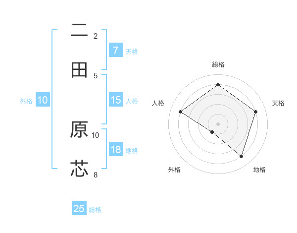 二田 原芯さんの総格は25画の4点!