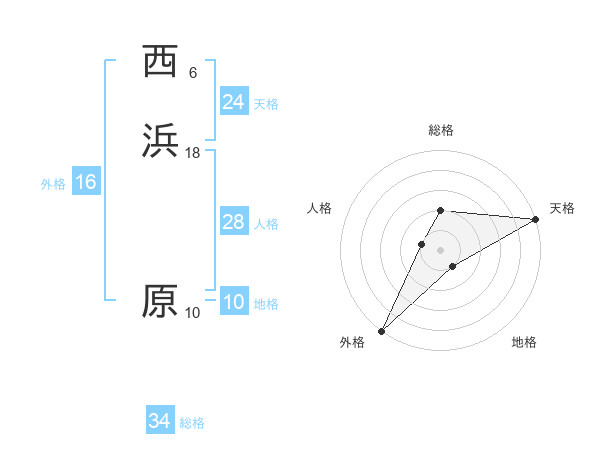 西浜 原さんの総格は34画の2点!