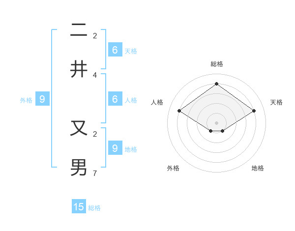 二井 又男さんの総格は15画の4点!