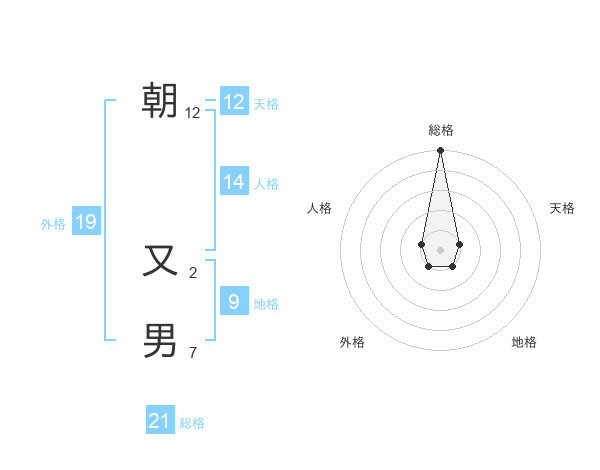 朝 又男さんの総格は21画の5点!