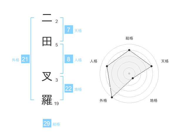 二田 叉羅さんを姓名の画数から五運を鑑定