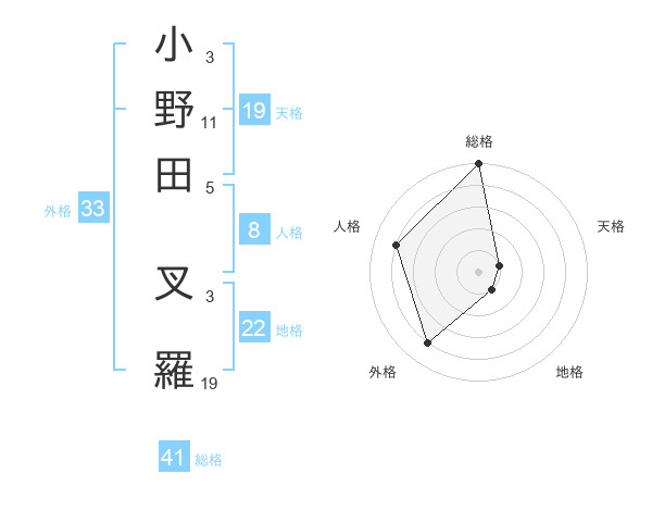 小野田 叉羅さんの総格は41画の5点!