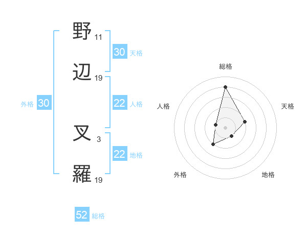 野辺 叉羅さんの総格は52画の4点!
