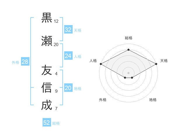 黒瀬 友信成さんの総格は52画の4点!
