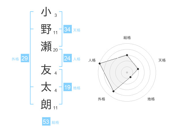 小野瀬 友太朗さんの総格は53画の3点!