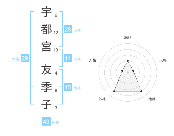 宇都宮 友季子さんを姓名の画数から五運を鑑定