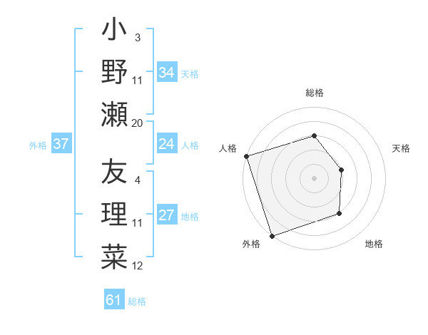 小野瀬 友理菜さんを姓名の画数から五運を鑑定
