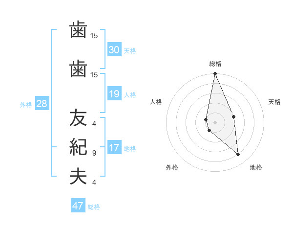 歯歯 友紀夫さんの総格は47画の5点!