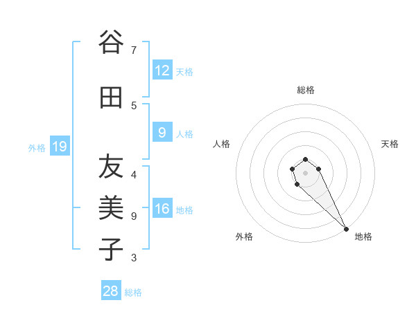 谷田 友美子さんの総格は28画の1点!