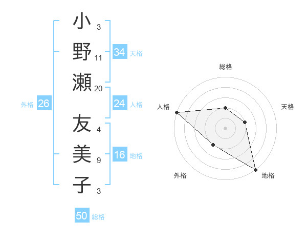 小野瀬 友美子さんを姓名の画数から五運を鑑定