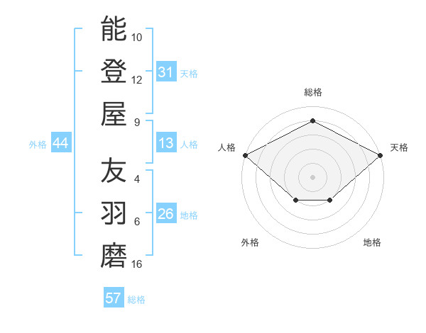 能登屋 友羽磨さんを姓名の画数から五運を鑑定