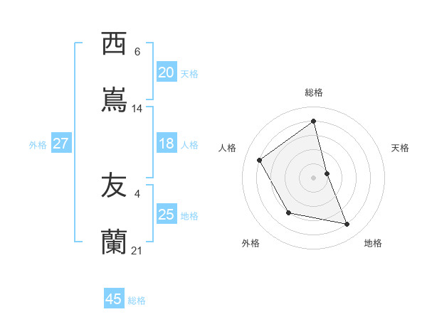 西嶌 友蘭さんの総格は45画の4点!