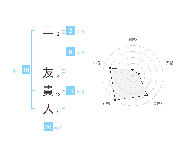 二 友貴人さんの総格は20画の1点!