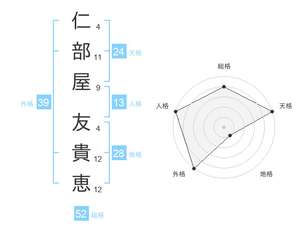 仁部屋 友貴恵さんの天格は24画の5点!