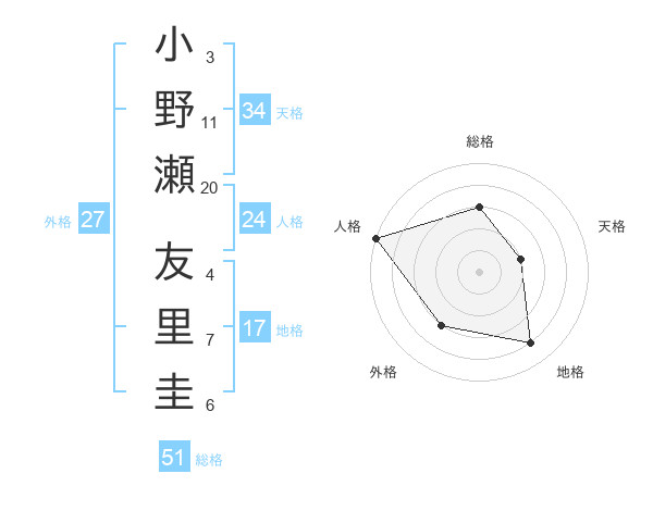 小野瀬 友里圭さんの総格は51画の3点!