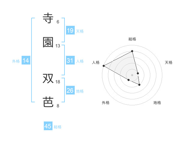 寺園 双芭さんの総格は45画の4点!