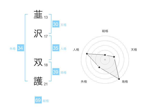 韮沢 双護さんの総格は69画の1点!