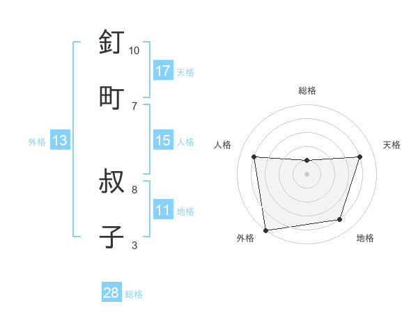 釘町 叔子さんの外格は13画の5点!