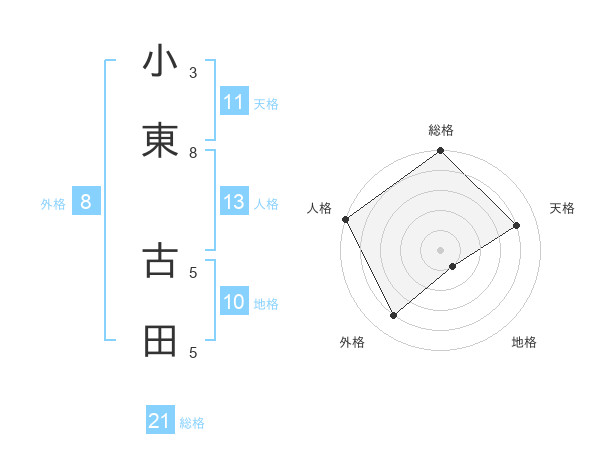 小東 古田さんの総格は21画の5点!