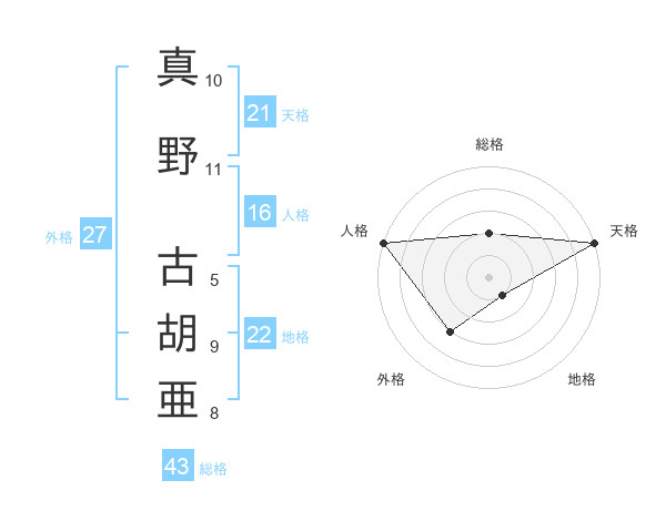 真野 古胡亜さんの天格は21画の5点!