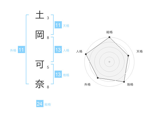 土岡 可奈さんの地格は13画の5点!