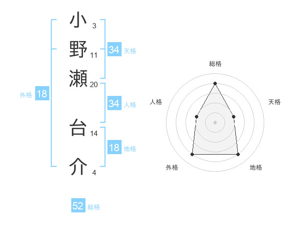 小野瀬 台介さんの総格は52画の4点!