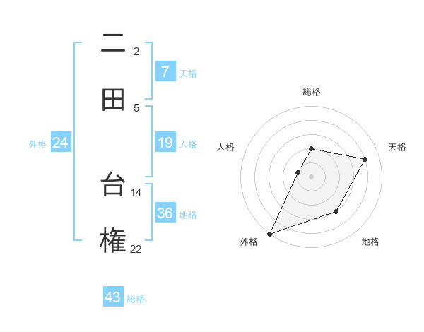 二田 台権さんの総格は43画の2点!