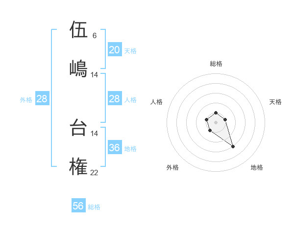 伍嶋 台権さんを姓名の画数から五運を鑑定