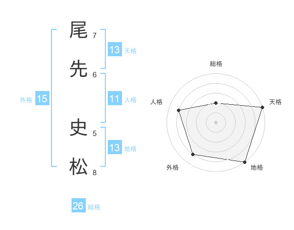 尾先 史松さんの総格は26画の2点!