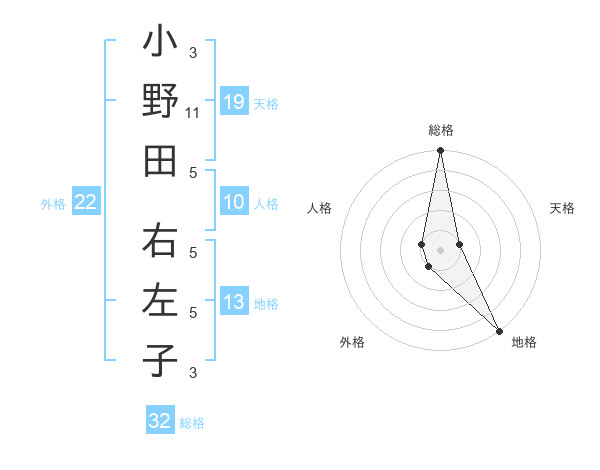 小野田 右左子さんの総格は32画の5点!