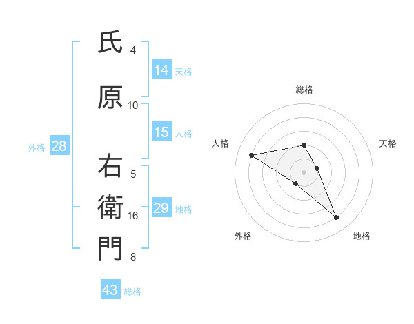 氏原 右衛門さんの総格は43画の2点!