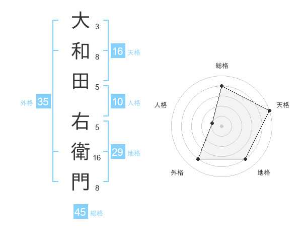 大和田 右衛門さんの天格は16画の5点