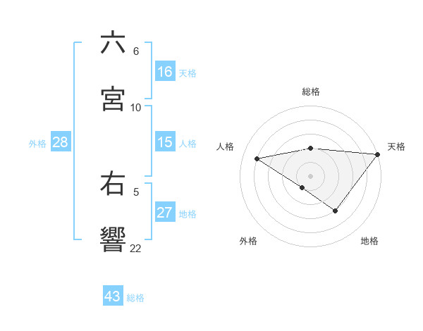 六宮 右響さんの天格は16画の5点!