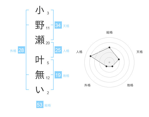 小野瀬 叶無いさんを姓名の画数から五運を鑑定