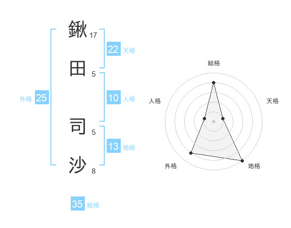 鍬田 司沙さんを姓名の画数から五運を鑑定