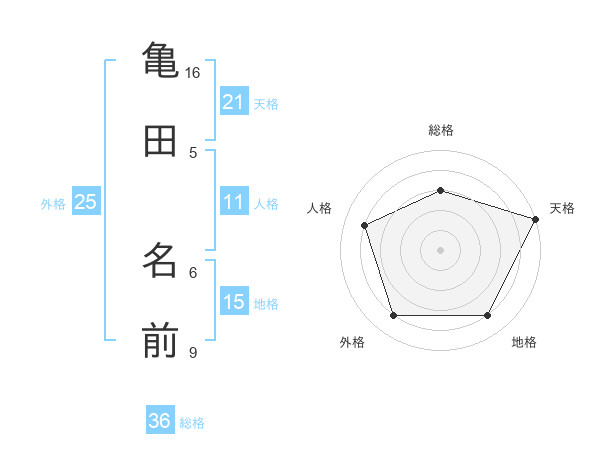 亀田 名前さんの天格は21画の5点!