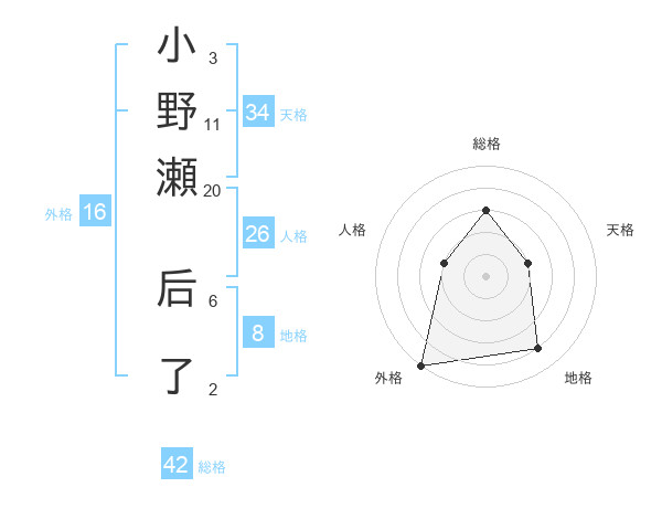 小野瀬 后了さんを姓名の画数から五運を鑑定