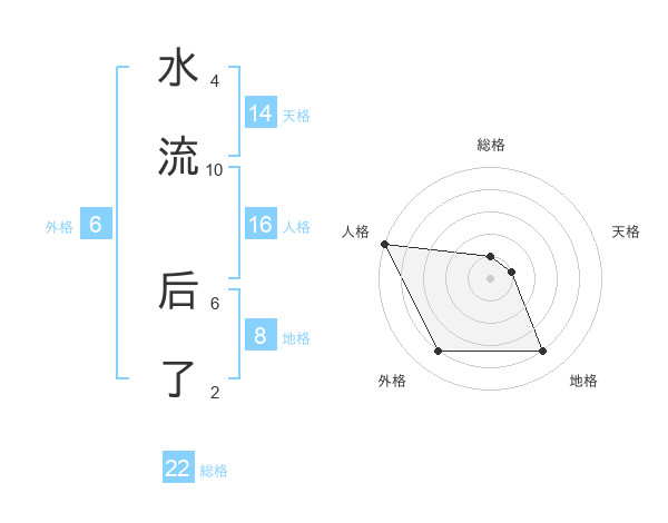 水流 后了さんの総格は22画の1点!