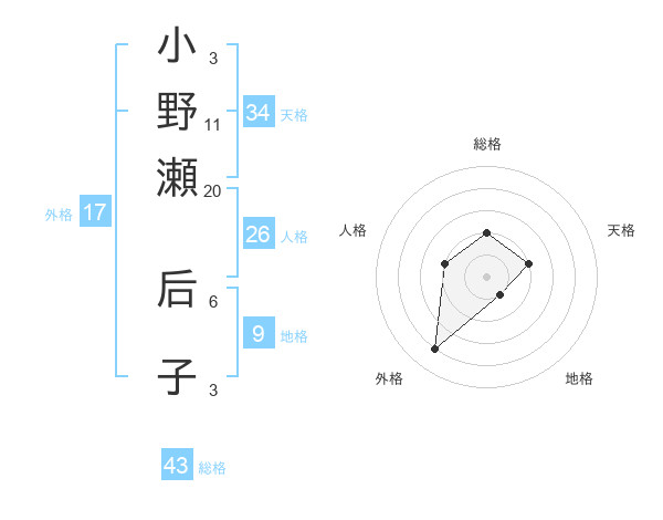 小野瀬 后子さんを姓名の画数から五運を鑑定