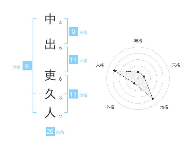 中出 吏久人さんの総格は20画の1点!