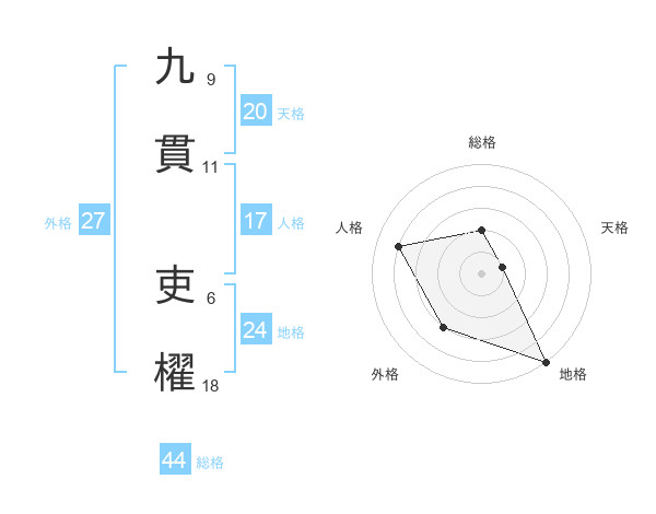 九貫 吏櫂さんの総格は44画の2点!