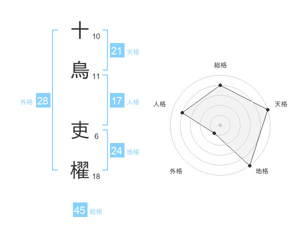 十鳥 吏櫂さんの天格は21画の5点!