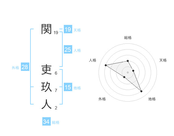 関 吏玖人さんの総格は34画の2点!