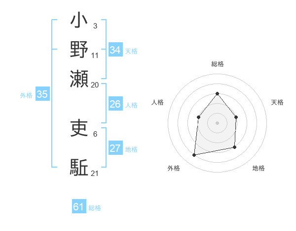 小野瀬 吏駈さんの総格は61画の3点