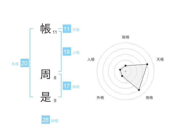 帳 周是さんの総格は28画の1点!