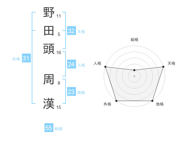 野田頭 周漢さんを姓名の画数から五運を鑑定