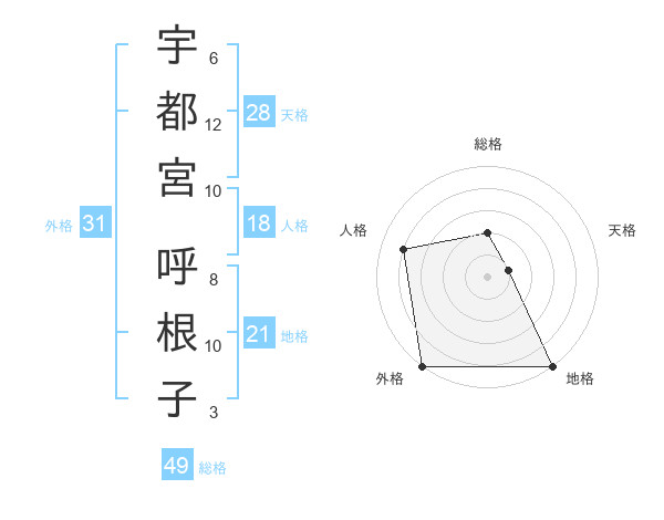 宇都宮 呼根子さんを姓名の画数から五運を鑑定