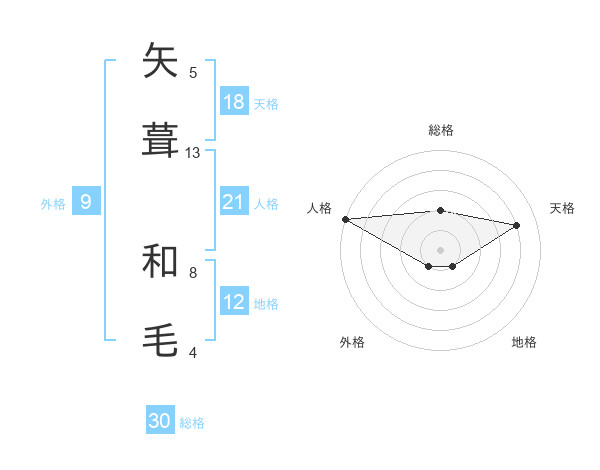 矢葺 和毛さんの総格は30画の2点!