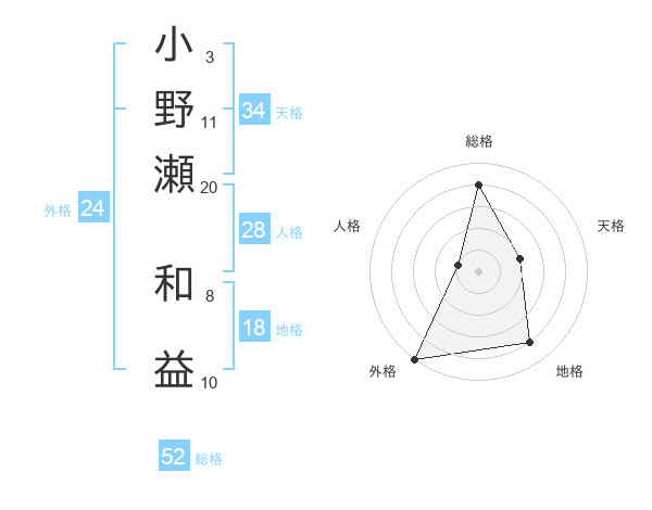 小野瀬 和益さんの総格は52画の4点!