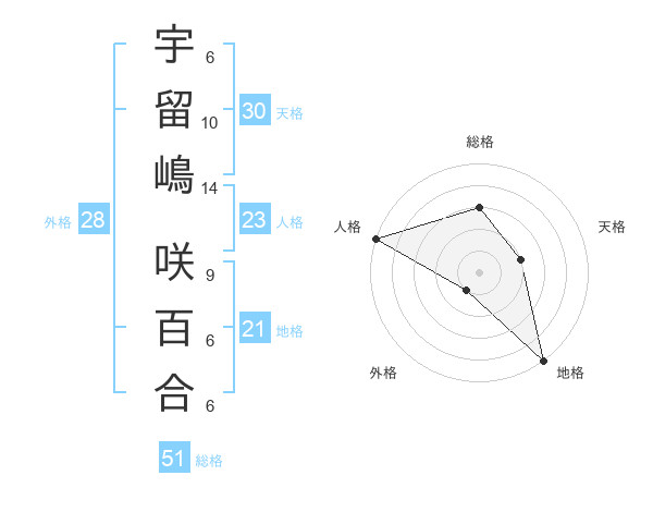 宇留嶋 咲百合さんを姓名の画数から五運を鑑定